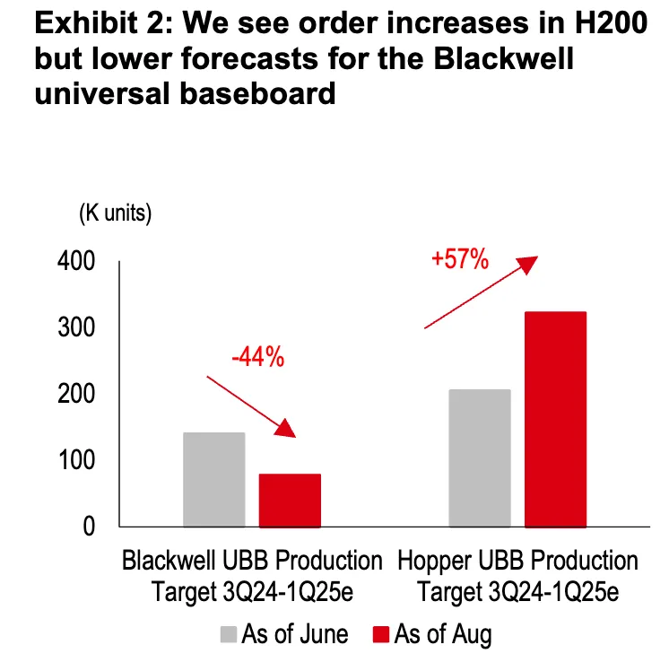根据 HSBC 的预测,B100/B200 基板(UBB)的生产已经修正了 44%,尽管交付可能部分推迟到 2025 年上半年,导致 2024 年下半年出货量减少,然而,H200 UBB 订单显著增加,预计在 2024 年第三季度至 2025 年第一季度增长了 57%。