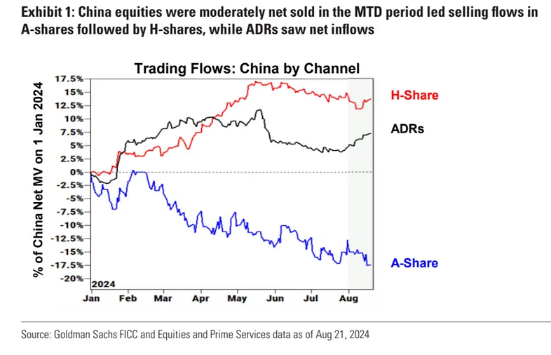 不过结构上,从高盛客户这边来看,2 月份以后基本是一直减持 A 股,最近幅增持的主要是 H 股和中概股:
