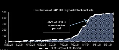 回购,目前是美国股市最强劲的技术支撑,企业在过去几周的回购活动达到正常水平的两倍,每天大约有 50 亿美元(年 1 万亿美元),这股买盘力量可能会持续到 9 月中旬后逐渐消退。