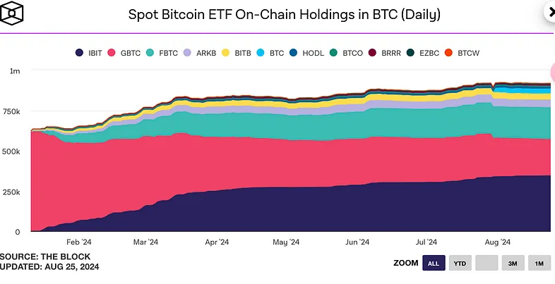 从下图可以看到大饼 ETF 的流入速度在 4 月份以后就显著减慢了,以大饼本位,最近 5 个月总共才增长了 10%,这与其价格在 3 月份见顶是相匹配的,如果无风险收益率下降,可能会吸引更多投资者进入黄金和大饼市场这是非常有可能的。