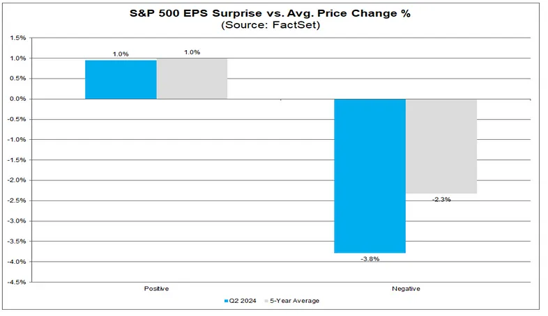 普 500 中 93% 的公司已公布实际结果,其中 79% 的公司 EPS 超出预期,60% 的公司营收超出预期。超预期公司的股价表现与历史均值基本持平,但逊于预期的公司股价表现要差于历史均值: