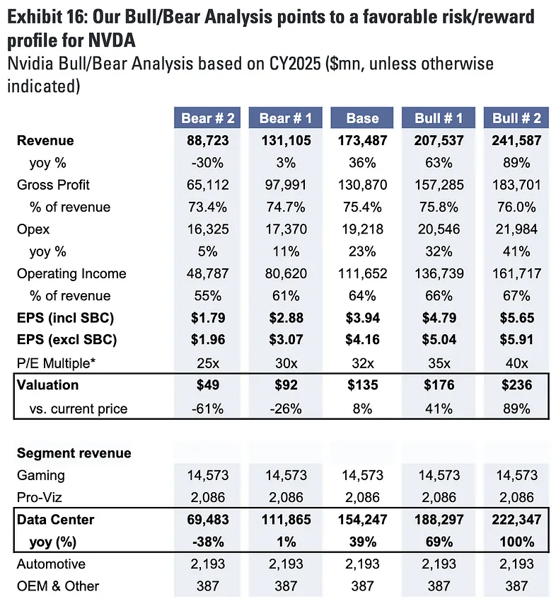 基于当前股价 124.58 美元,基线预期股价 135 美元,Bull #1 和 Bull #2 分别涨 41%,89%,Bear #1Bear #2 分别跌 61% 和 26%。也就是在当前价位水平上,NVDA 的潜在回报仍然小于风险。