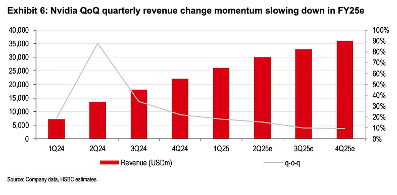 市场共识预期 2025 财年收入是 1056 亿美元,对比去年是 609 亿美元,增速由去年的 126% 放缓至 73%。官方 guidance Q2 收入是 280 亿美元,市场预计会更乐观一些,但本季业绩增速将从 2x% 的增速区间进一步放缓至 1x% 的增速区间: