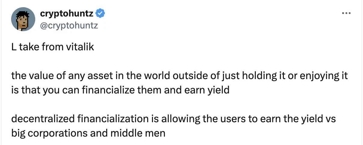 世界上任何资产的价值,除了持有或享受它之外,还在于你可以将它们金融化并赚取收益。