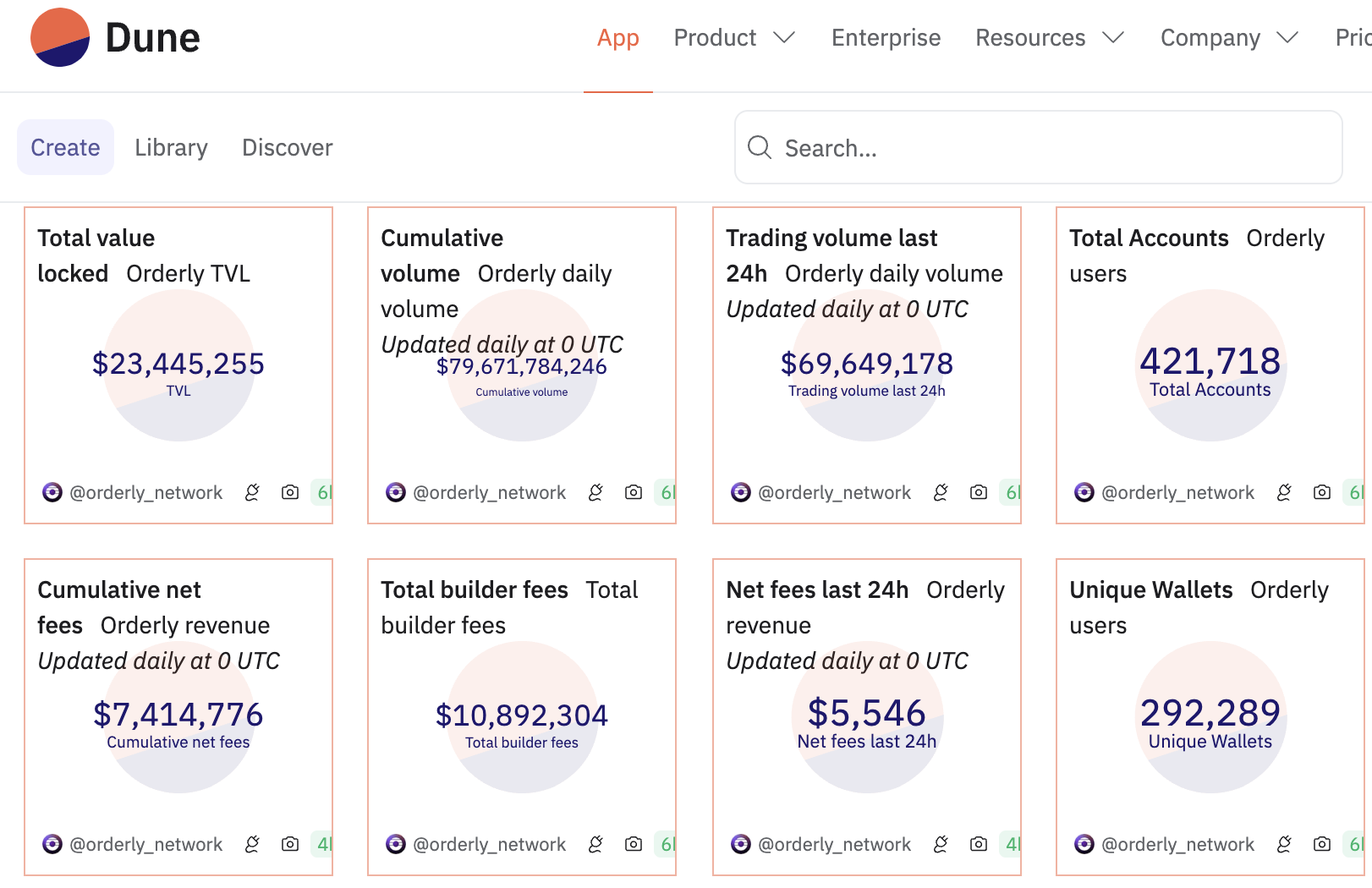 近期数据显示,Orderly Network 的日交易量达到了 10 亿美元,在 DEX 中排名前三。其交易占 Celestia 的 41%,排行第一,对 LayerZero 总量占比最高达 28%。根据 Dune 数据,目前 Orderly Network 累计总交易量 790 亿美元,净收入达到 740 万美元,用户超过 29 万。