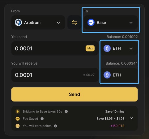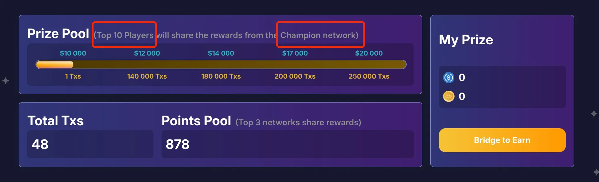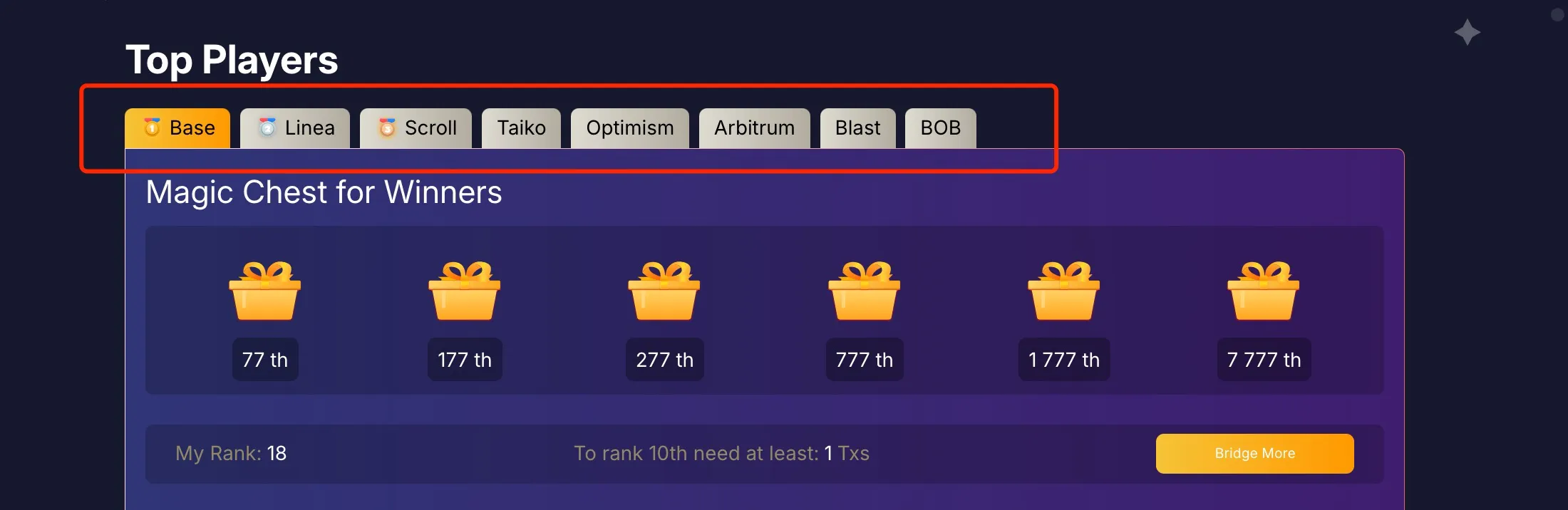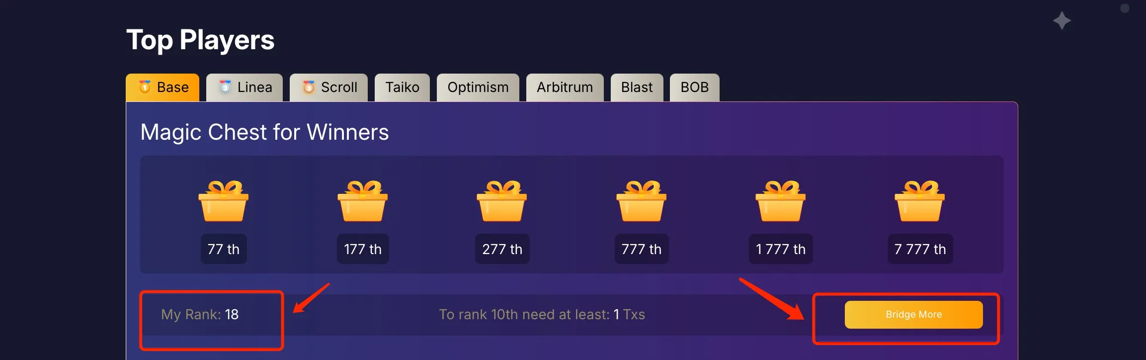 · 检查你在特定网络上的排名。排名会决定你可以从现金奖池中获得的金额。但请注意,排名是实时变化的!点击「更多桥接」,访问跨链页面进行跨链。