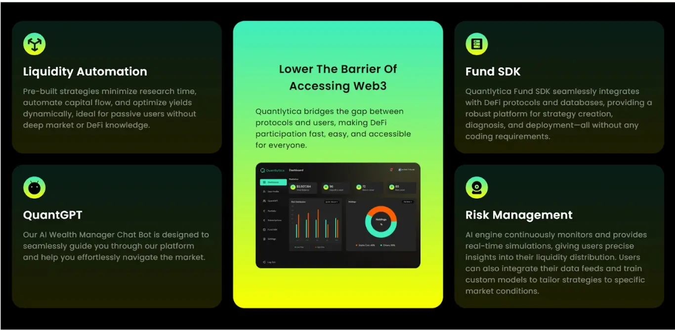 Quantlytica 总部位于芬兰,是一个多链 AI 驱动的流动性分配协议。Quantlytica 利用机器学习和统计模型,对所有 DeFi 项目的回报、流动性风险和安全性进行横向比较,并根据不同用户的需求提供多种自动化策略。Quantlytica 的 Fund SDK 工具包进一步降低了协议与用户之间的交互门槛,使 DeFi 参与变得更加快速、简单和人人可及。简而言之,Quantlytica 是您的流动性门户,助力寻找和构建最佳流动性策略的过程变得更加顺畅。