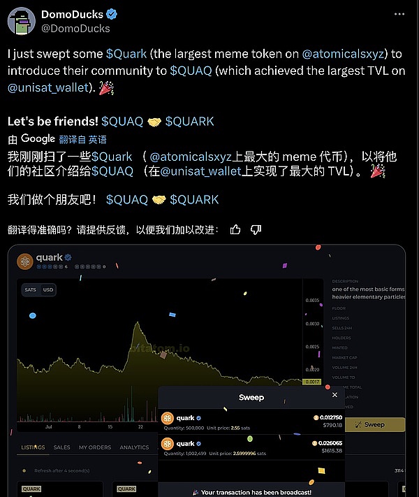 ● BRC20 社区 DomoDunk 创作者,购买了一些$Quark,以将 Quark 社区介绍给 BRC20 $QUAQ 社区,BTC 生态社区之间互帮互助交朋友,赞!