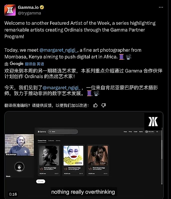 ● Gamma 最新一期艺术家介绍。本周特色艺术家 Sherie 是肯尼亚蒙巴萨的艺术摄影师。她通过肖像摄影表达自我和情感,致力于推动非洲数字艺术发展。Sherie 正为肯尼亚艺术家在比特币平台上开辟新道路。