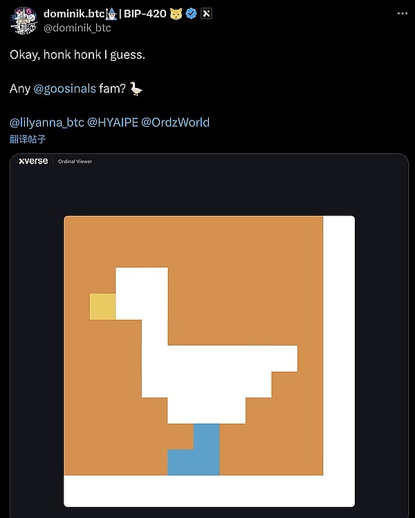 ● Xverse 钱包亚洲发展经理,量子猫、OMB 社区 OG,Domi 今天正式购入大鹅 Goosinals。