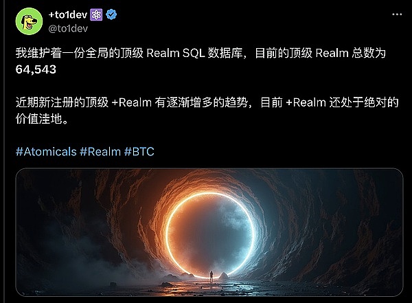 ● Atomicals 社区开发者 @to1dev 表示,他在维护着一份全局的顶级 Realm SQL 数据库,目前的顶级 Realm 总数为 64,543。近期新注册的顶级 +Realm 有逐渐增多的趋势,目前 +Realm 还处于绝对的价值洼地。