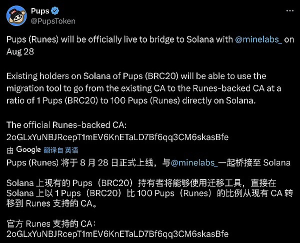 ● $Pups (Runes) 将于 8 月 28 日正式上线,与 @minelabs_ 一起桥接至 Solana。Solana 上现有的 Pups(BRC20)持有者将能够使用迁移工具,直接在 Solana 上以 1 Pups(BRC20)比 100 Pups(Runes)的比例从现有 CA 转移到 Runes 支持的 CA(官方 Runes ca:2oGLxYuNBJRcepT1mEV6KnETaLD7Bf6qq3CM6skasBfe)。