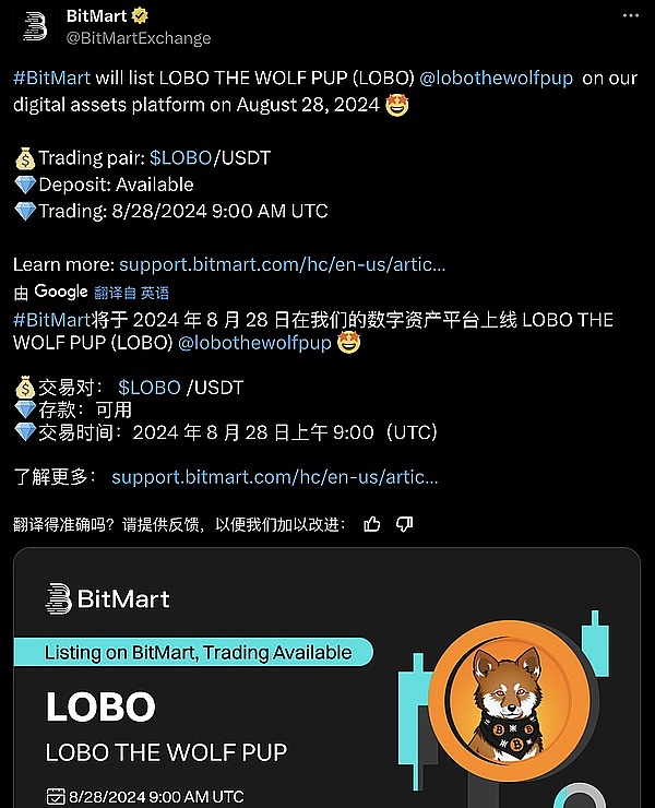 ● BitMart 将于 2024 年 8 月 28 日上线 9 号符文 LOBO•THE•WOLF•PUP (LOBO) @lobothewolfpup @Geniidata 数据显示目前链上市值为 1650 万美金。