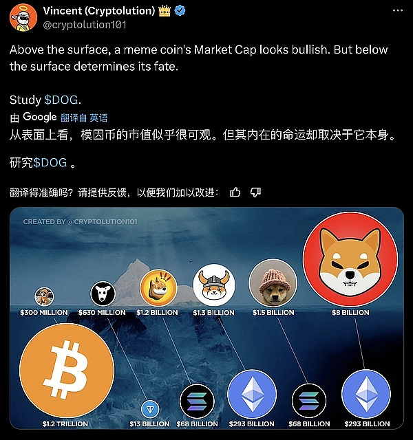 ● $DOG 社区制作了一张非常直观的市值对比图。包含每一条公链市值和对应公链的狗狗 meme 市值。@cryptolution101 表示,从表面上看,meme 币的市值未来似乎很可观。但其内在的命运却取决于它本身。