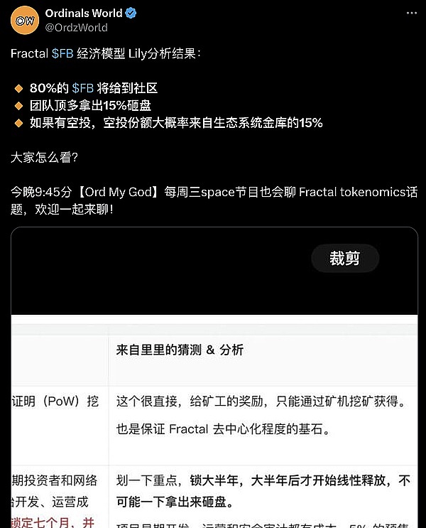 ● BTC 科普女神 @lilyanna_btc 分析 $FB 模型后表示,Fractal 80% 的 $FB 分配给社区,如果有空投,空投的份额大概率来自生态系统金库的 15%。