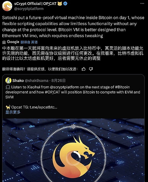 ● OP_CAT OG @scryptplatform xiaohu 表示 中本聪在第一天就将面向未来的虚拟机放入比特币中,其灵活的脚本功能允许无限的功能,而无需在协议级别进行任何更改。在我看来,比特币虚拟机的设计比以太坊虚拟机更好,后者需要无休止的调整。
