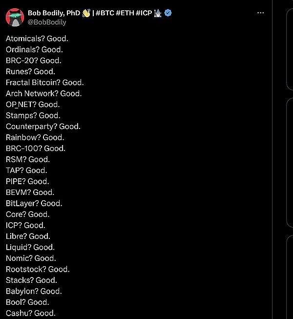 ● Bob 博士 罗列了 50+的 BTC 生态协议项目。前十位包括 Atomicals、Ordinals、BRC-20、Runes、Fractal Bitcoin、Arch Network、OP_NET、Stamps、Counterparty、Rainbow。
