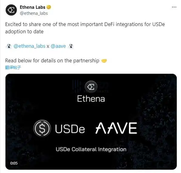 Ethena宣布与Aave进行深度集成,后者将支持USDe存入和借出等