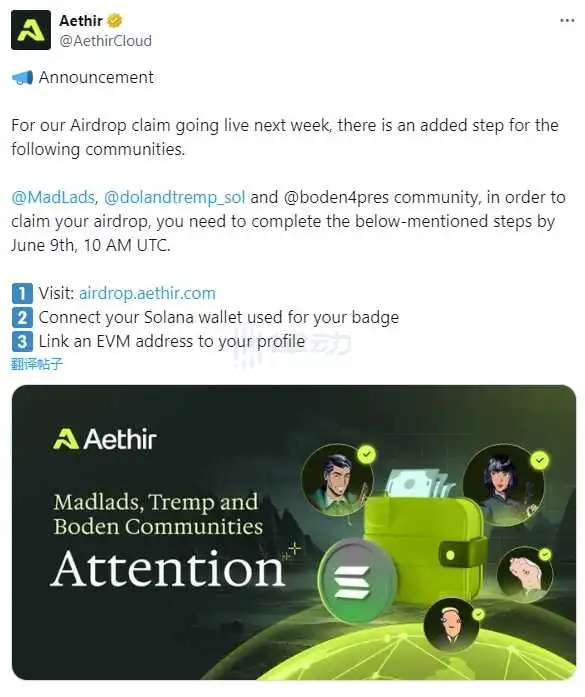 Aethir:空投认领将于下周上线,Mad Lads等社区需提前绑定EVM地址