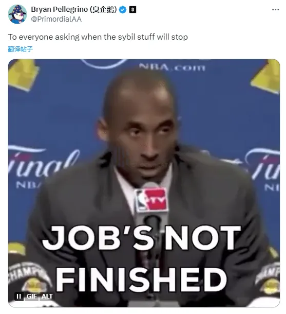 6 月 7 日,LayerZero CEO Bryan Pellegrino 于社交平台发文表示:「致那些询问女巫(审查)工作什么时候结束的人」并配图,「工作尚未完成」。