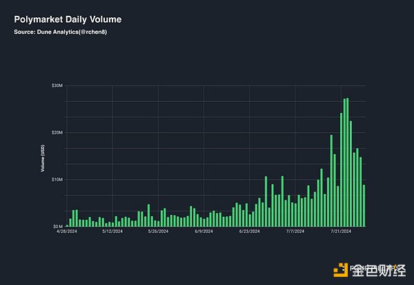 美国总统大选是全球最受瞩目的事件之一,随着公众的注意力集中在美国总统大选上,预测市场上涌现出大量押注大选结果的用户。因此,截至6月,领先的预测市场平台Polymarket显示的数据令人印象深刻:月交易量超1.1亿美元,每日约3000名交易员进行超1万笔交易。就在美国总统大选的第一天,约有4000名交易员参与了Polymarket的预测市场。随着最近围绕着大选的公众兴趣的加剧,该平台的日交易量飙升至近3000万美元。