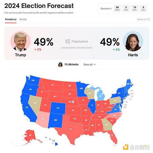 此外,Polymarket还是有效管理信息过载加密市场未来风险的关键预测工具。加密市场的特点是特定叙事对资产价格具有重大影响,因为对根本价值仍然缺少明确的共识。随着新兴项目数量的不断增加,市场参与者需要吸收的信息的规模及其多样性也在增加。Polymarket解决了这个问题,它通过经济激励将分散的预测聚合成一个统一的观点,有可能提供一个更客观的视角,而不受个人偏见或误解的干扰。
