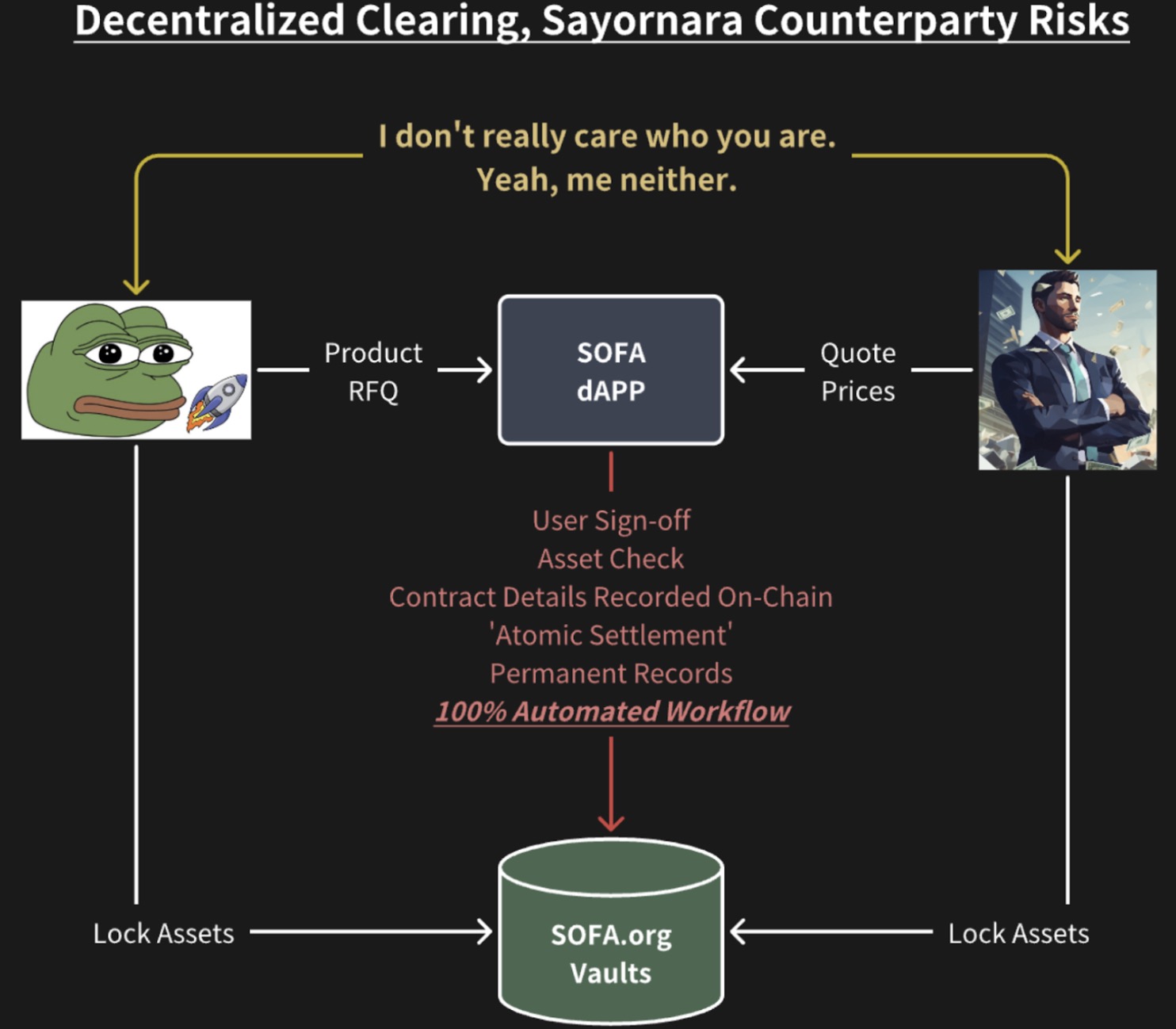 SOFA.org 成立的主旨是为链上任何金融资产(包括现实世界资产 RWA 和代币化资产)奠定数字清算和结算生态系统的基础。由具备丰富机构背景的资深专业人士开发,SOFA.org 旨在普及创新产品到链上普通用户,同时利用区块链固有的安全优势,提供端到端完全安全透明的资产工作流。通过利用智能合约金库的固有安全性,交易执行和对手方风险可以完全消除,从而使用户能够专注于他们交易的内容,而不是交易对象。