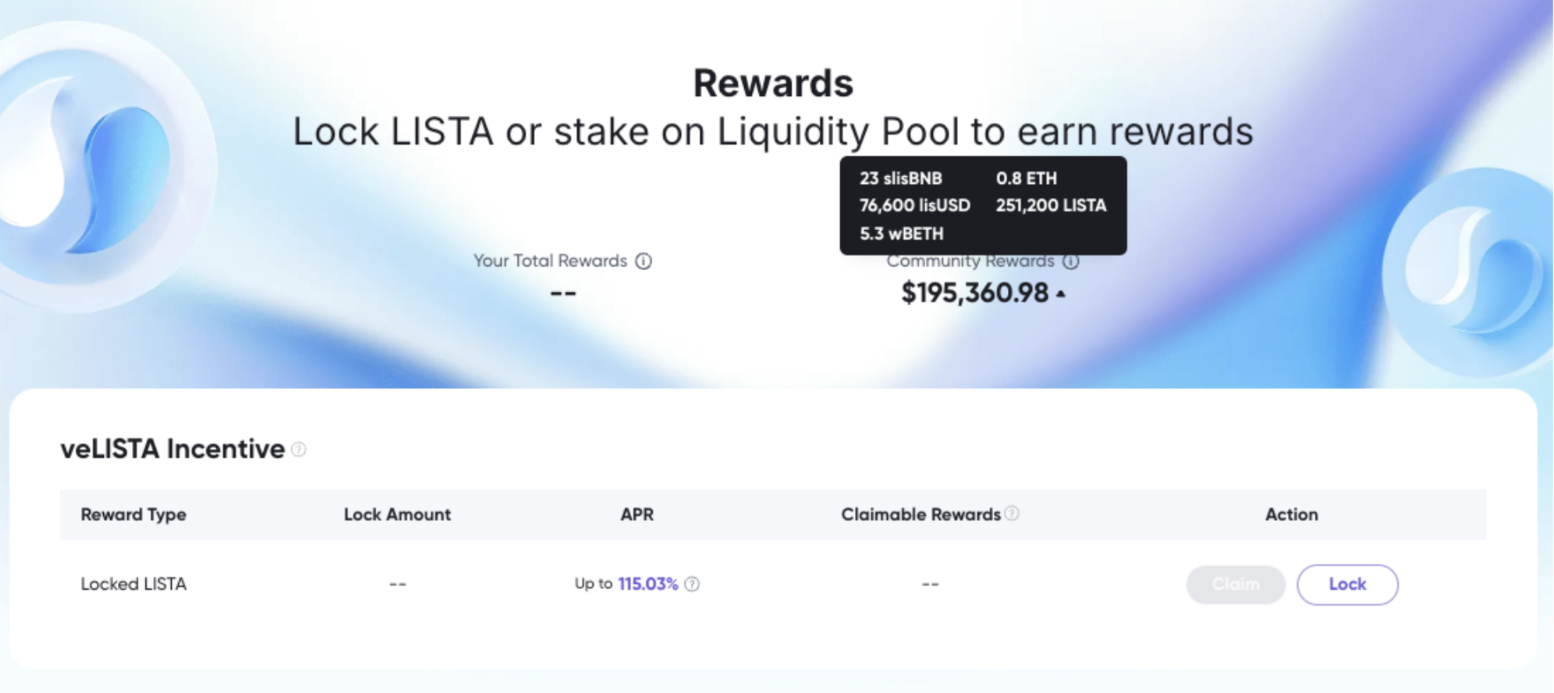 Lista DAO 的收入来源包括来自锁仓 LISTA 的 Early Claim Fee、流动性质押手续费、即将推出的 lisUSD 铸造费、lisUSD 借款利息以及 ETH 提现费。因此用户的激励包括 slisBNB、WBETH、lisUSD、veLISTA 等。截止撰稿前,据官网数据,已有超 19.5 万美元奖励分发给了社区。