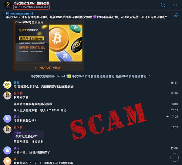 根据多位受害者的描述,骗子在 Telegram 上冒充知名交易所建立诈骗群组,这种诈骗群的组员动辄几千上万人,很容易让人放松警惕。不少用户在 Telegram 上搜索官方账号时会把群人数当作辨别账号真伪的因素之一。官方群的人数会比较多是没错,但是这个逻辑倒推回来就不一定对了。难以想象,骗子建立一个有上万人的群竟是为了骗几只“羊”,甚至里面的“闲聊”都是诱饵。值得注意的是,一个有五万多人的群,在线人数却不足一百人,参考其他万人群的在线人数情况,用户们或许能意识到有些不对劲了。