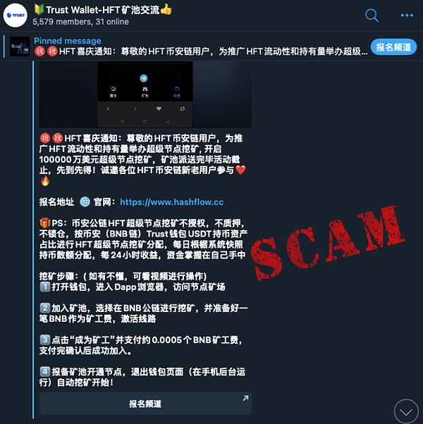 下图中的骗局则是通过诱导用户进行恶意授权,从而盗取用户资金。骗子冒充官方声称有“超级节点挖矿活动”,邀请用户参与挖矿。用户按照操作指南点击钓鱼链接后,被诱导进行恶意授权,最终导致资金被盗。