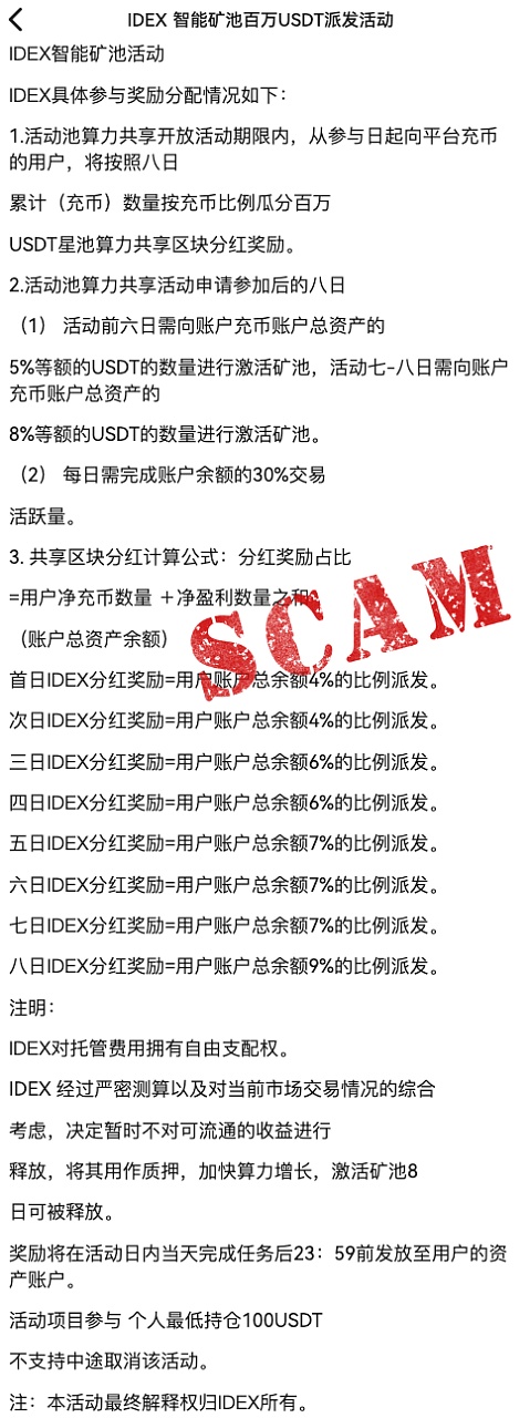 还有一种骗局是骗子先将用户引导至诈骗平台,并通过操控平台数据制造出用户“盈利”的假象。然而,这些盈利只存在于平台的显示上,并不代表实际的资产增加。在这一阶段,用户已经被骗子“高超”的投资能力所迷惑。接下来,骗子进一步邀请用户参与矿池活动,并规定用户每天需要向充币账户充值总资产的 5% 或 8% 的 USDT 以激活矿池。为了获得分红,并在“如果不继续充值就无法赎回本金”的压力下,用户不断向骗子提供的账户充值。看到这里大家也明白了,这个玩法意味着用户每一天都要比前一天充更多的 USDT。