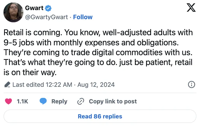 散户即将到来。那些过着朝九晚五生活、有着每月开销和责任的成年人,他们正准备与我们一起交易数字商品。请耐心等待,散户正在路上。