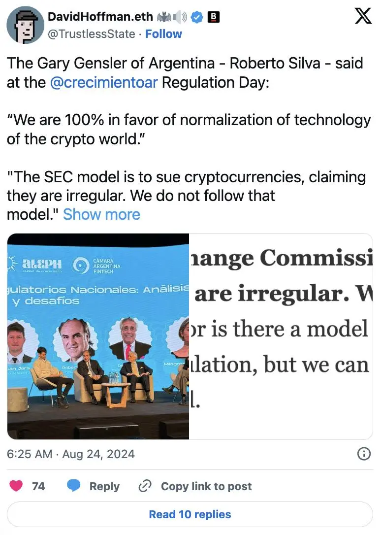 被称为阿根廷版 Gary Gensler 的 Roberto Silva 在 @crecimientoar 监管日上表示: