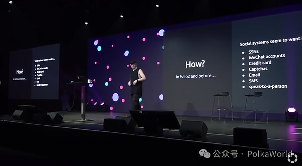 Web2 的一个基础是高级服务模式,这在很大程度上依赖于识别用户的能力。20 多年前,用户识别机制可能不那么复杂,但现在情况大不相同。如果你想开一个账户,通常会有三种以上的机制来确认你是否是真正的个体,是否是他们以前没有见过的用户。比如,如果你尝试在没有购买 iPhone 的情况下注册一个 Apple 账户,那简直就像在闯关一样,这些公司基本上不愿意给你一个账户。当然,他们宣传说你可以免费获得账户,但我不知道后台的 AI 在做什么,我自己尝试了 10 次才最终成功。结果我还是不得不买了一部 iPhone。