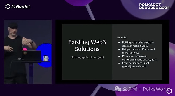 把某个东西放在链上并不意味着它就是 Web3。你可以把 Web2 的策略或依赖中心化权威的策略简单地移到链上,但这样做并不会改变策略本身。它只意味着这个策略可能会更有韧性地执行,但策略本身仍然不是 Web3。仅仅因为一个名字是一个很长的十六进制字符串,并不意味着它一定是私密的。如果不采取特定措施,这种字符串仍然可能与现实世界的身份信息关联起来。
