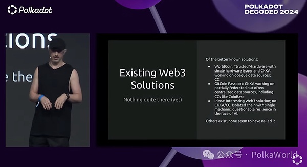 有一些系统尝试解决这个问题,但它们依赖于单一硬件和常见的密钥管理机构,所以并不是真正的 Web3 方案。比如,Worldcoin 这个项目尝试通过可信硬件来解决这个问题,但它使用了一个统一的密钥管理机构和集中化的数据源,因此不太符合 Web3 的去中心化理念。