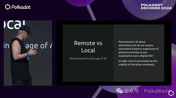 关于个体身份,有两种思考方式:一种是远程的,另一种是本地的。机器并不能天然理解“个体身份”,我们不太可能看到某种加密技术突然解决这一问题。有人可能会说,指纹或生物识别技术能够让人类具有独特性,机器可以测量这些,但纯数字系统很难证明这一点。可能最接近这个目标的系统是 Worldcoin,但它也只是一个机器,能够以一种不容易被破解的方式进行验证。