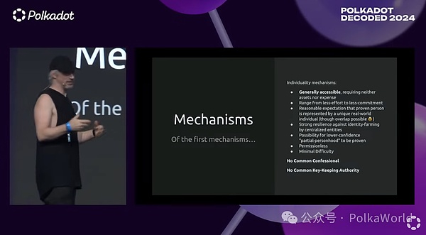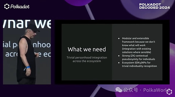 我认为,让 Polkadot 在现实世界中更加有用(不仅仅是在 DeFi、NFTs 和虚拟区块链领域),关键在于找到一种简单的方法来识别个人身份。这里的识别并不是指确定这个人是谁,比如不是说 “ 我知道这是 Gavin Wood ”,而是识别 “ 这是一位独特的个人 ”。我不认为会有单一的解决方案,因此我们需要一个模块化且可扩展的框架
