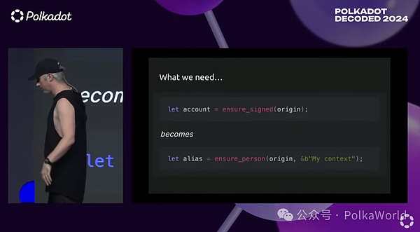 最后,我们需要强大的 SDK 和 API,使这个功能像 Substrate 或 Polkadot 智能合约中的任何其他功能一样易于使用,或者在即将到来的 JAM 生态系统中也是如此。它必须易于使用。比如说,具体一点,我不知道这里有多少编写过 Frame 代码的人,但在编写新的区块链时,你经常会看到一行代码 let account = ensure_signed (origin)。这行代码的作用是获取交易的来源,并确认这个来源是否来自某个账户,如果是,则告诉我这个账户是什么。但账户并不等同于个人,一个人可能使用一个或多个账户,同样,一个脚本也可能使用一个或多个账户。账户本身无法提供任何关于个体身份的信息,至少单独无法做到。所以,如果我们想确保某笔交易来自一个真实的人,而不是一百万个账户中的某一个,我们就需要能够将这一行代码替换为另一行代码 let alias = ensure_person (origin, &b"My context")。