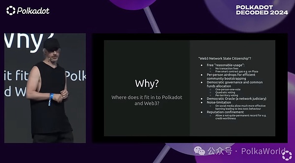 如果我们设想这样的广场链(Plaza),可以想象一个不需要支付 gas 费用的情景。只要你在合理的使用范围内,gas 是免费的。当然,如果你编写脚本或进行大量交易,那么你就需要支付费用,因为这已经超出了普通个人的使用权利范围。试想一下,这些系统开始免费向公众开放,我们可以通过空投等方式,有针对性地、高效地启动社区。同时,我们还可以设想更为先进的 Polkadot 治理方式。