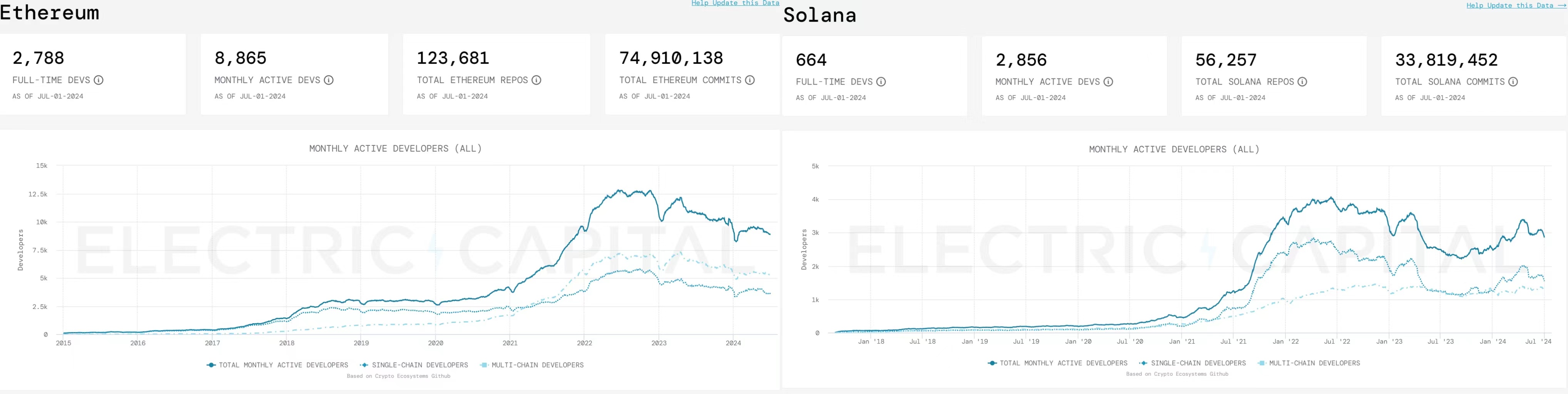 以太坊生态及 Solana 生态开发者资源和人力资本状况对比,图源来自 Electric Capital