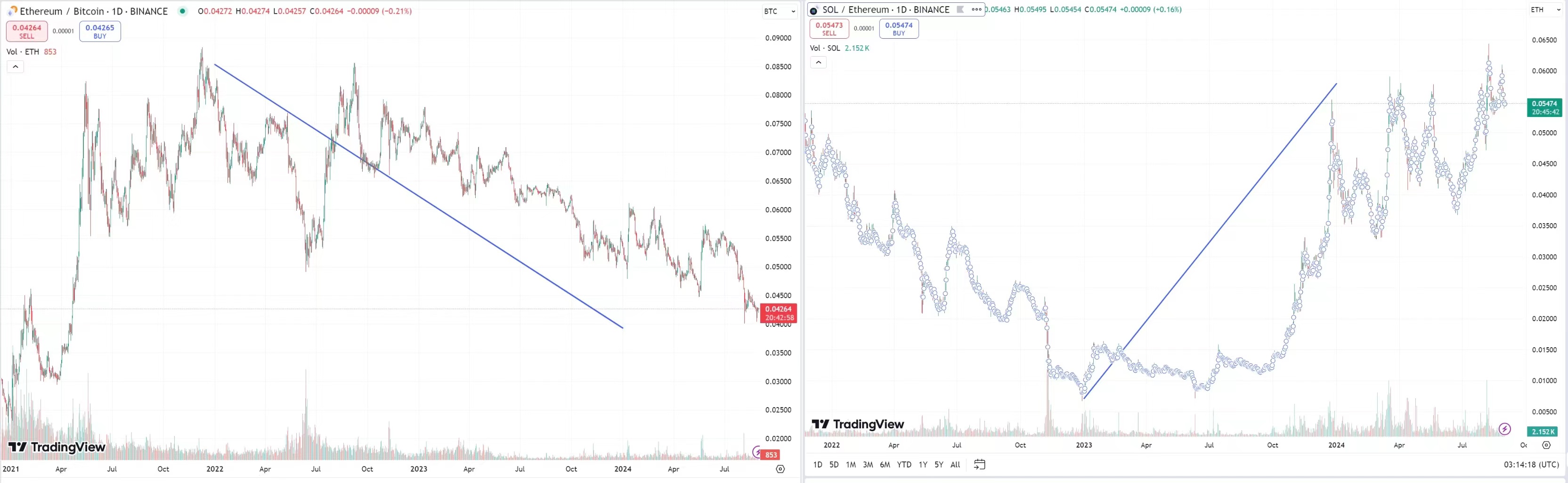 左:ETH/BTC 的比值在过去两年内下跌了 50%;右:SOL/ETH 在过去一年中的年增长率达到了 300%
