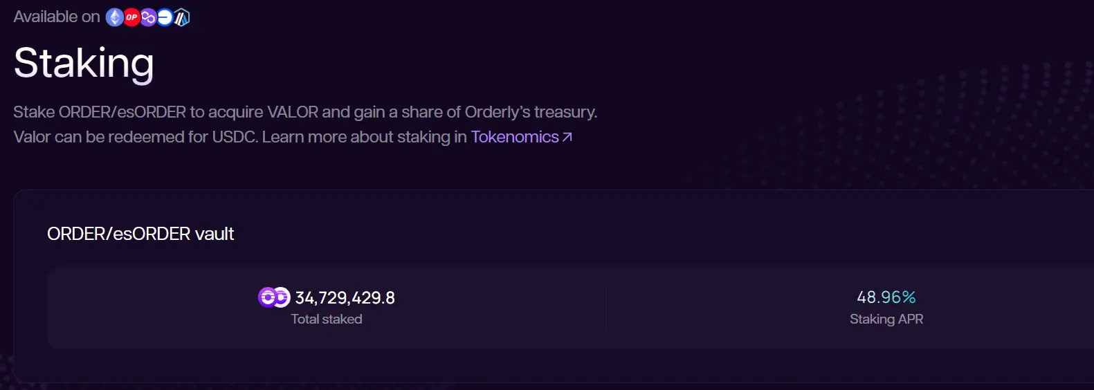 与其它DeFi应用的治理代币不同,$ORDER是实用性代币,用户可以通过质押ORDER解锁多种奖励,其中最重要的就是Orderly Network网络60%的新增收入将分配给ORDER质押用户,等用户解锁时,且质押奖励最终会以USDC形式支付给用户,是真正的将收入赋能ORDER代币持有人的DeFi产品。