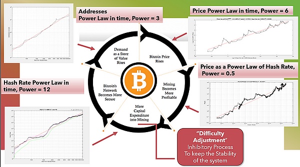 这是令人难以置信的,因为它表明比特币的演变是由规模不变的属性驱动的。它也完全符合比特币的实际含义:一个自我参照和自适应网络。特别是难度调整,这是中本聪最天才的创新之一,是幂律背后的关键机制,而非稀缺性。这构成了比特币的适应性属性。幂律是迭代过程的数学和物理表达,其中输出成为输入(由于难度调整,哈希率现在会影响以后的哈希率)。正如我已经证明的那样,这不仅仅是在文字上,而且还展示了精确的数学,它产生了我们所观察到的时间幂律。