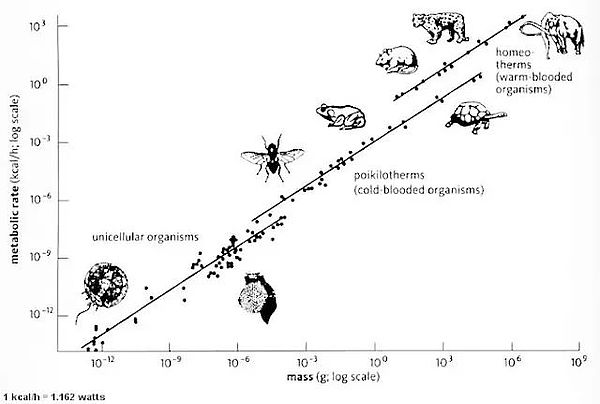 我之前提到过称为克莱伯定律的权力定律。它决定了动物的体重与它生存所需的能量之间的关系。大小的尺度从果蝇等小生物到大象,范围为7个数量级。这基本上就是 BTC 从交易 10,000 BTC = 1 美元托达时所经历的