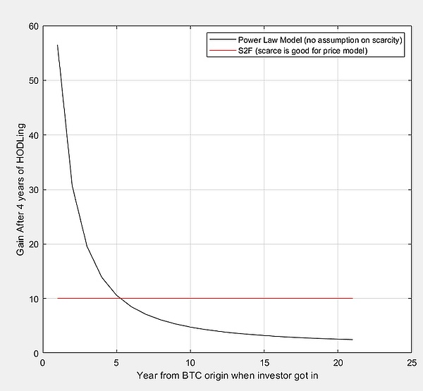 那个告诉我她用稀缺性论点告诉人们快点去获取一些 BTC 的人(顺便说一句,这是个好消息)也告诉我“坚持数字”。我听从了她的建议(不确定她到底是什么意思,但我再次知道她的意图是好的)。但数学就是数学。这里有两个模型,幂律模型对稀缺性的假设为零,仅基于对价格以可预测的方式上涨的观察。稀缺性根本不是模型的一部分。另一种是S2F,其中稀缺性是主要驱动力,事实上,它假设稀缺性随着时间的推移而增加。幂律(不假设稀缺性)导致“现在就赶紧买一些比特币”。正如你所看到的,S2F 表示你可以随时加入,并且仍然可以获得相同数量的收益,无论你是 10 年前加入(同样持有 4 年时间)还是 10 年后加入(同样是 4 年持有时间)。相同的 HODLING 时间)。在此期间,两位投资者都将获得 10 倍的回报。当您注意到幂律模型时,尽快加入很重要。那么,您是否看到人们如何利用稀缺性论证得出没有事实支持的不合逻辑的结论?