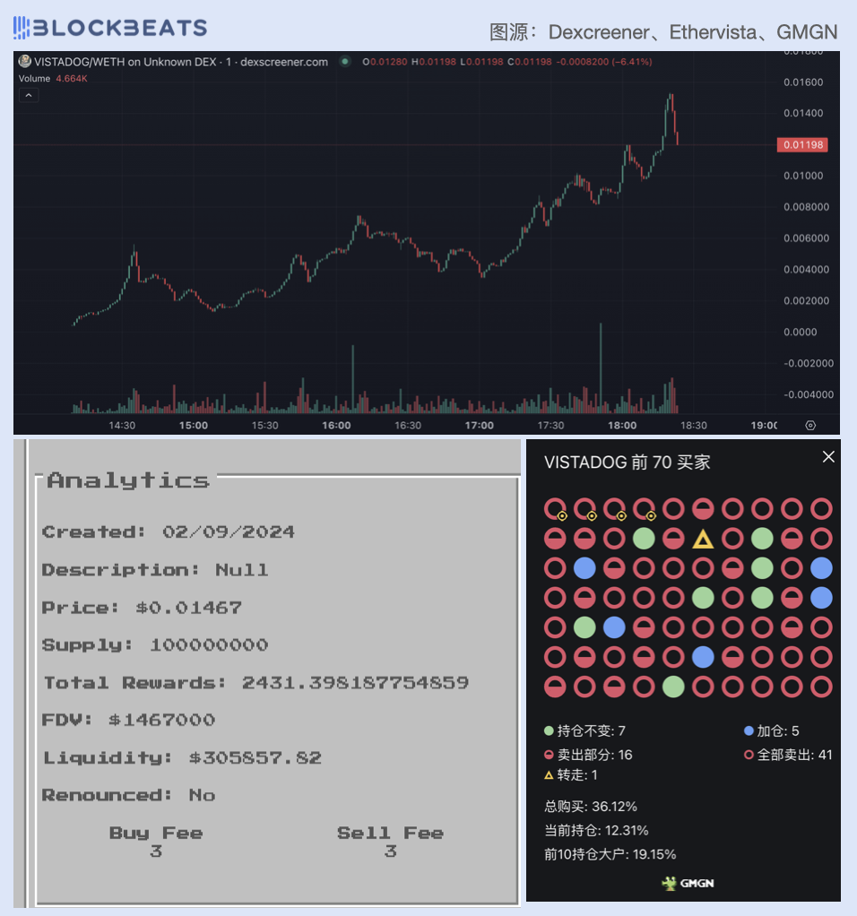 VISTADOG 创建于 9 月 2 日下午 2 时左右,上线后 4 小时涨幅超 40 倍,交易量 150 万美元。截止撰稿时市值为 120 万美元。EtherVista 上显示,VISTADOG 目前共为其 LP 产生了 2,431 美元的奖励。GMGN 数据显示,VISTADOG 前 70 名买家共购买了 36% 的代币,目前持仓份额为 12%。