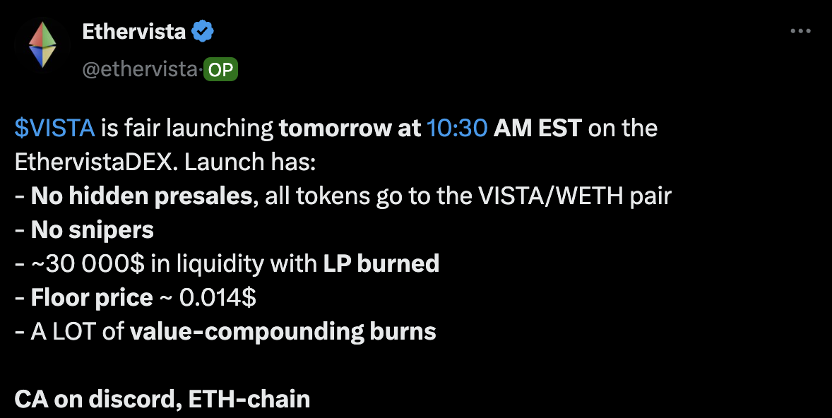 8 月 31 日,EtherVista 在官推宣布将在 9 月 1 日上午开启 VISTA 的 Fair Launch,初始流动性约为 3 万美元,并且 LP 代币将被销毁。代币的发行价大约是 0.014 美元,按照现价 18 美元计算,涨幅为 12857 倍。上线之前,EtherVista 官推声明没有预售和团队预分配,会在上线时使用团队资金以公平的方式与其他用户同时购买自己的代币。