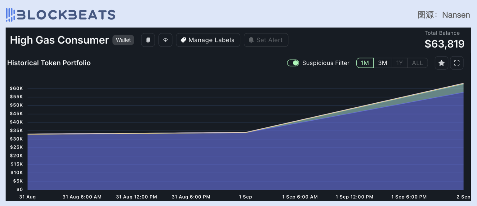 在Nansen上,这个钱包地址被标记为「High Gas Consumer」,目前共有 63,819 美元,分别为价值 57,856 美元的 ETH、4,875 美元的 CLIPPY 和 281 美元的 VISTA。而其在昨日拥有 33,833 美元的 ETH,也就是说,EtherVista 开发者通过 VISTA 收获了的 24,023 美元的 ETH。