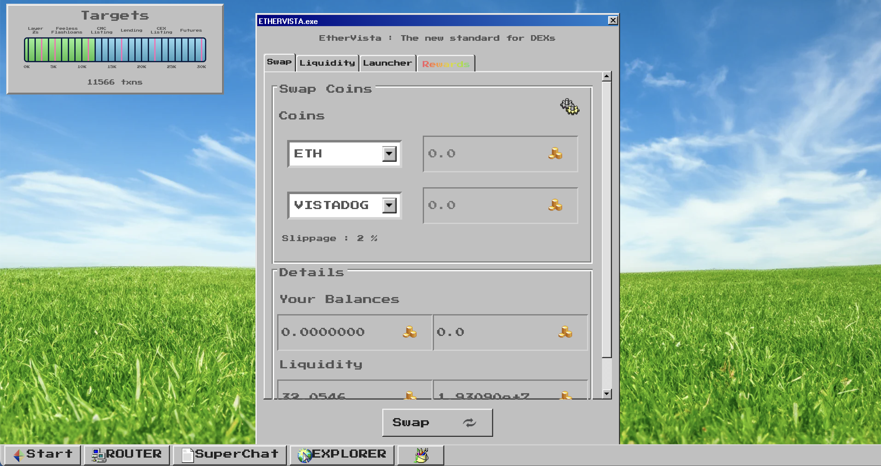 EXPLORER 窗口可以查看平台上创建的代币信息详情,这些信息由代币创建者定义,涵盖网站链接、项目描述、社交媒体账号等。与其他一般代币信息展示格式不同的是,在 EtherVista 上可以查看代币所产生的奖励,这些奖励将会分给 LP。